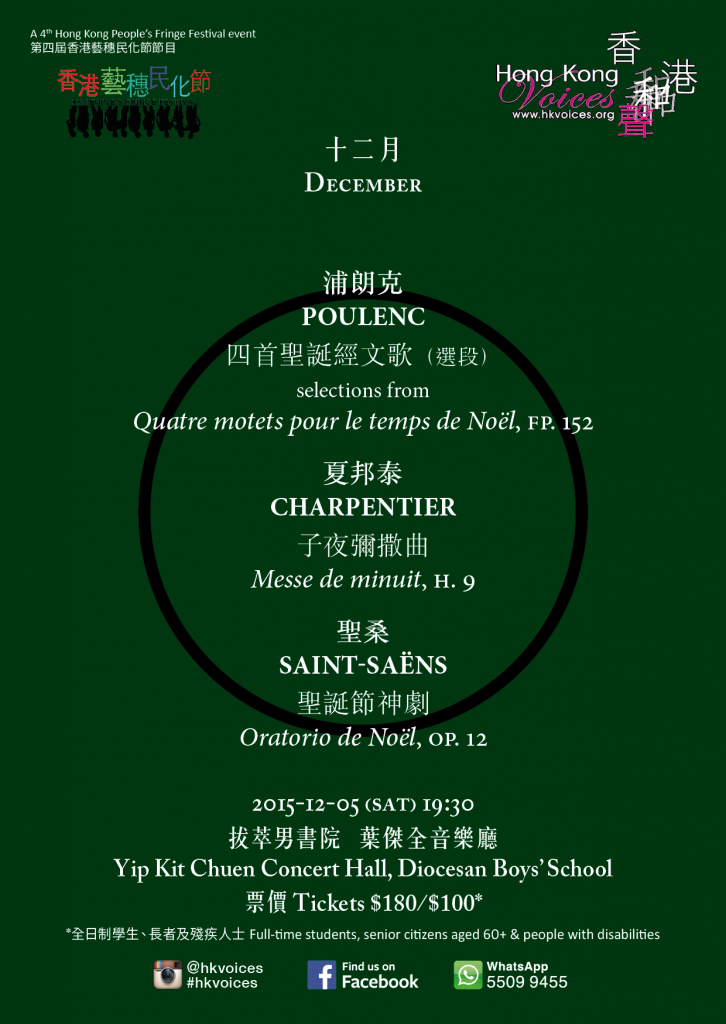 香港和聲十五周年壓軸鉅獻,為您帶來一場法式音樂盛宴,以不同時代的合唱經典慶祝聖誕。夏邦泰是十七世紀巴洛克時期最優秀的法國作曲家之一,他的《子夜彌撒曲》完全建基於民間的聖誕頌歌,開創音樂史先河。聖桑以多首大型管弦樂曲聞名,不過創作合唱樂曲亦同樣耍家,23歲就任巴黎瑪德蓮教堂首席管風琴師,短短兩個星期便寫成名作《聖誕節神劇》。二十世紀巴黎作曲家浦朗克,富韻味的旋律和清澈通透的和聲為人津津樂道,其《四首聖誕經文歌》把他的風格展露無遺。十二月五日,預祝聖誕,齊來親身體驗一趟法國聖誕音樂之旅!