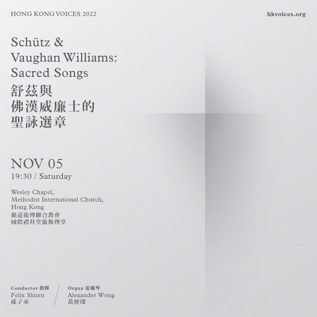 In this Autumn of abating pandemic and ongoing wars in distant lands, Hong Kong Voices brings to you sacred songs by Schütz & Vaughan Williams.