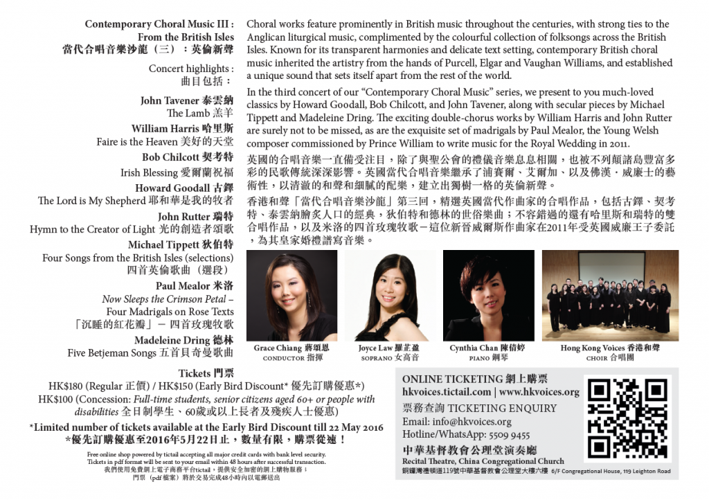 香港和聲「當代合唱音樂沙龍」第三回,精選英國當代作曲家的合唱作品,包括古鐸、契考特、泰雲納膾炙人口的經典,狄伯特和德林的世俗樂曲;不容錯過的還有哈里斯和瑞特的雙合唱作品,以及米洛的四首玫瑰牧歌-這位新晉的威爾斯作曲家在2011年受英國威廉王子委託,為其皇家婚禮譜寫音樂。